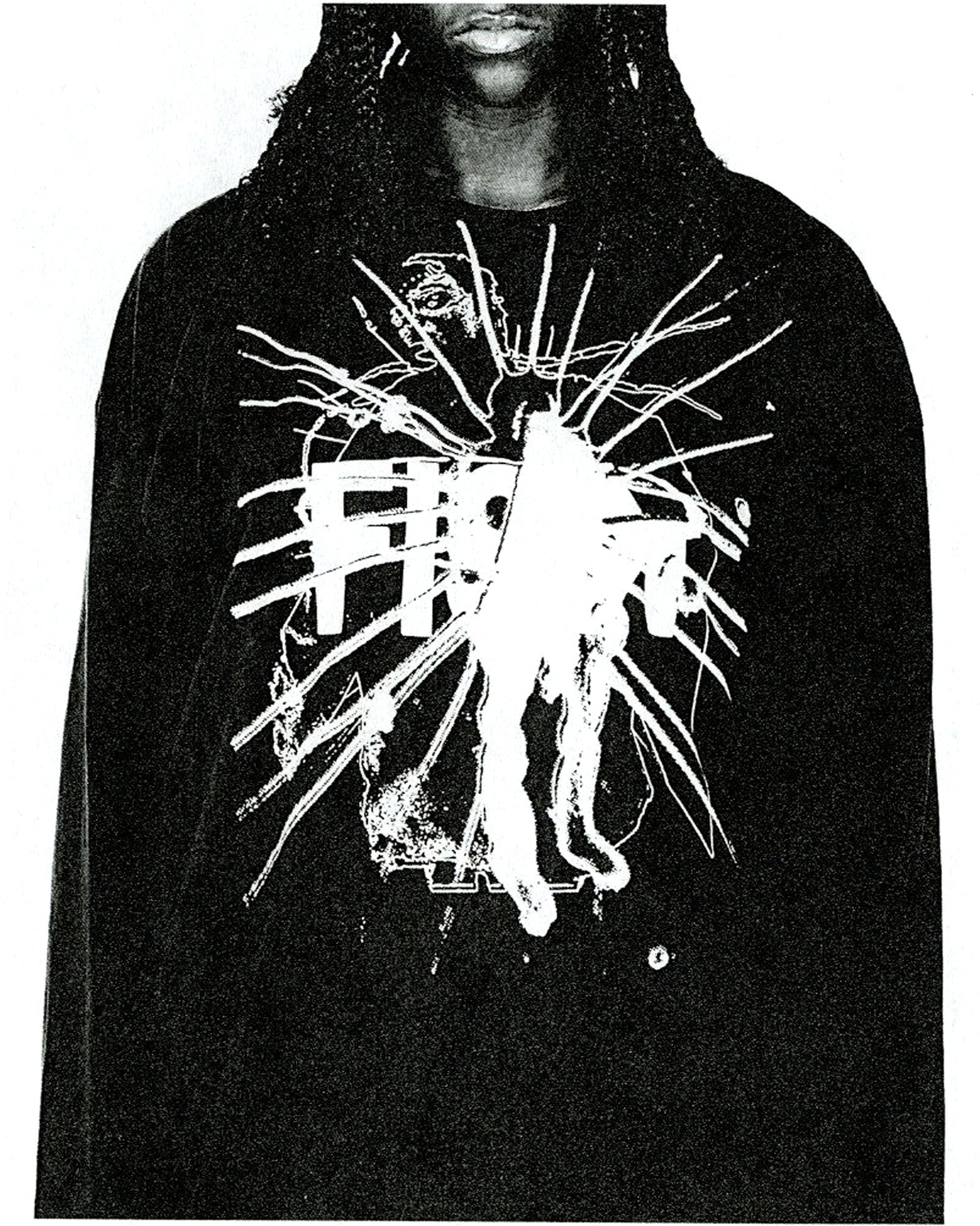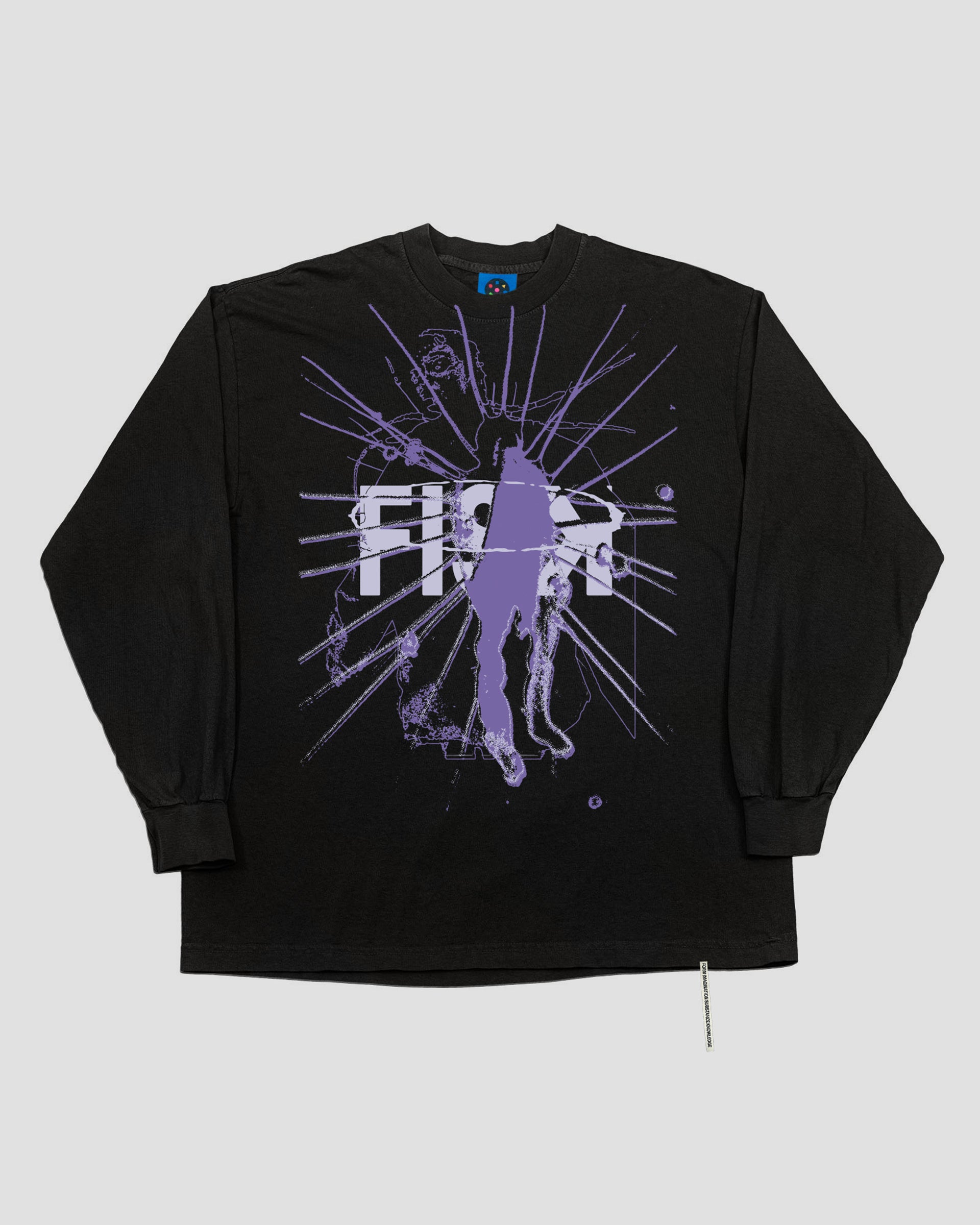 6.5oz Garment longsleeve shirt in Black. Made in LA, printed in Portland. Featuring 2-color oversized print over collar on front and 1-color screen print on back. Custom acronym woven label at front hem and FISK sizing label in collar.