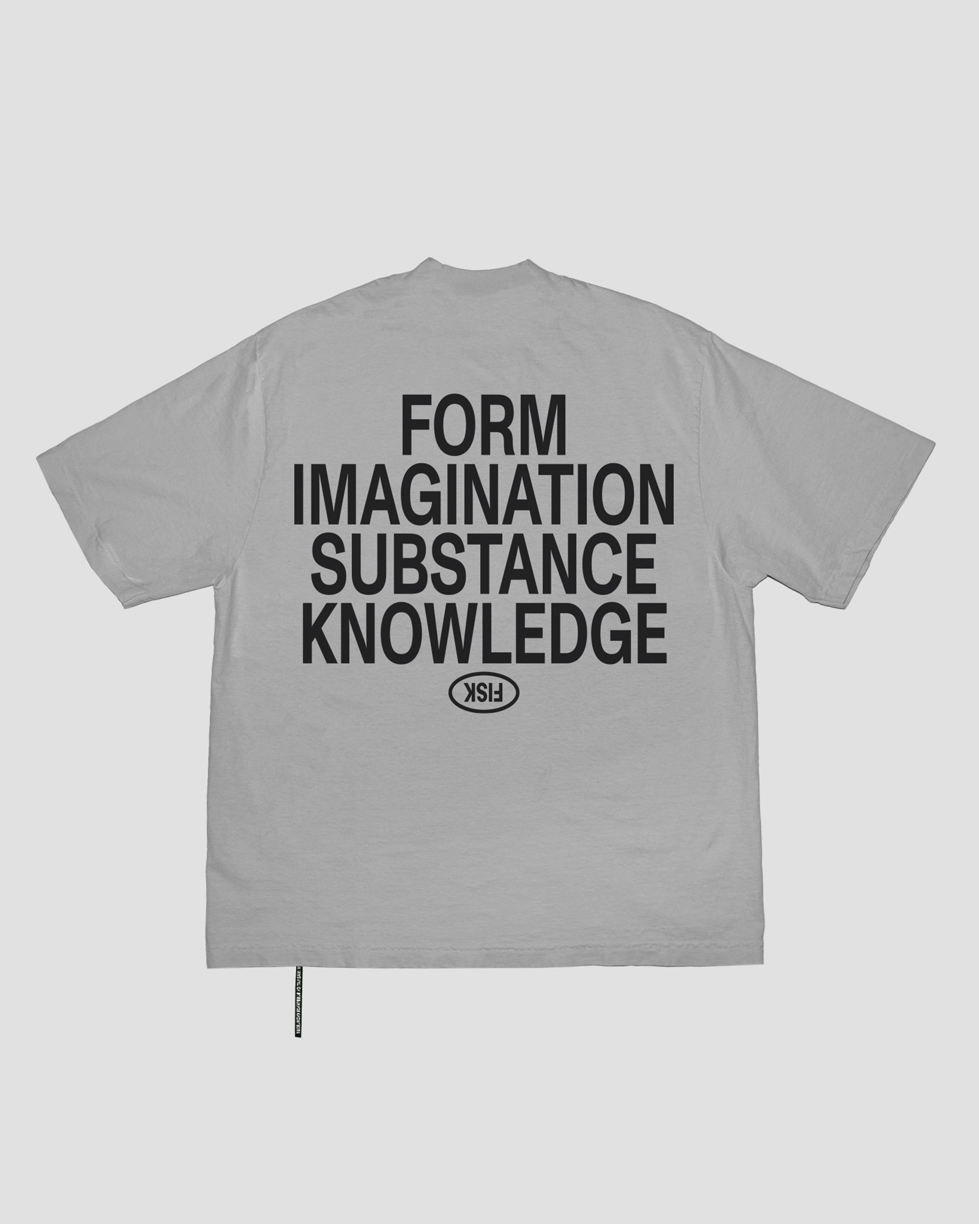 6.5oz Garment dyed boxy mockneck shirt in Silver. Oversized fit. Made in LA, printed in Portland. Featuring 2-color oversized print over collar on front and 1-color screen print on back. Custom acronym woven label at hem and FISK sizing label in collar.