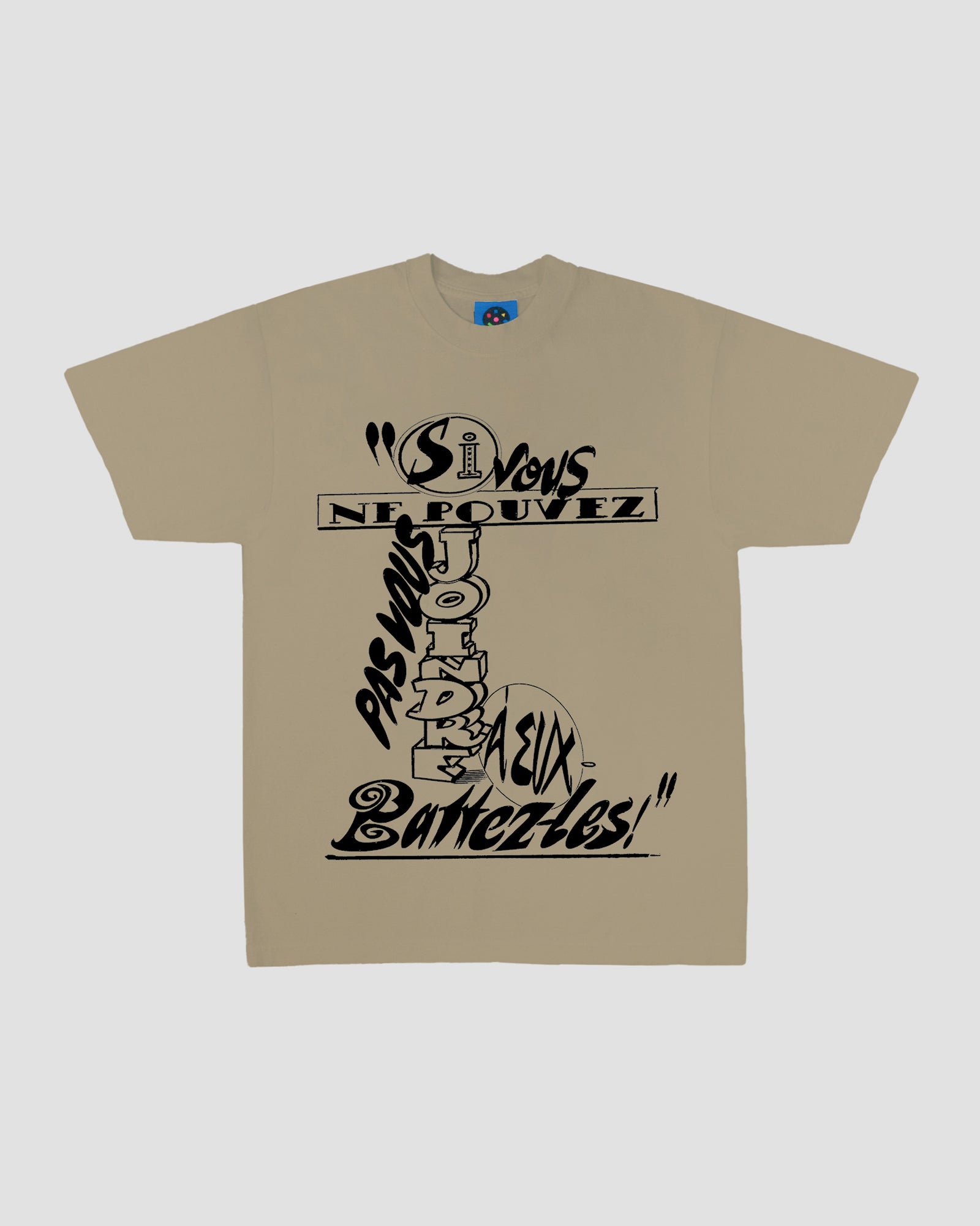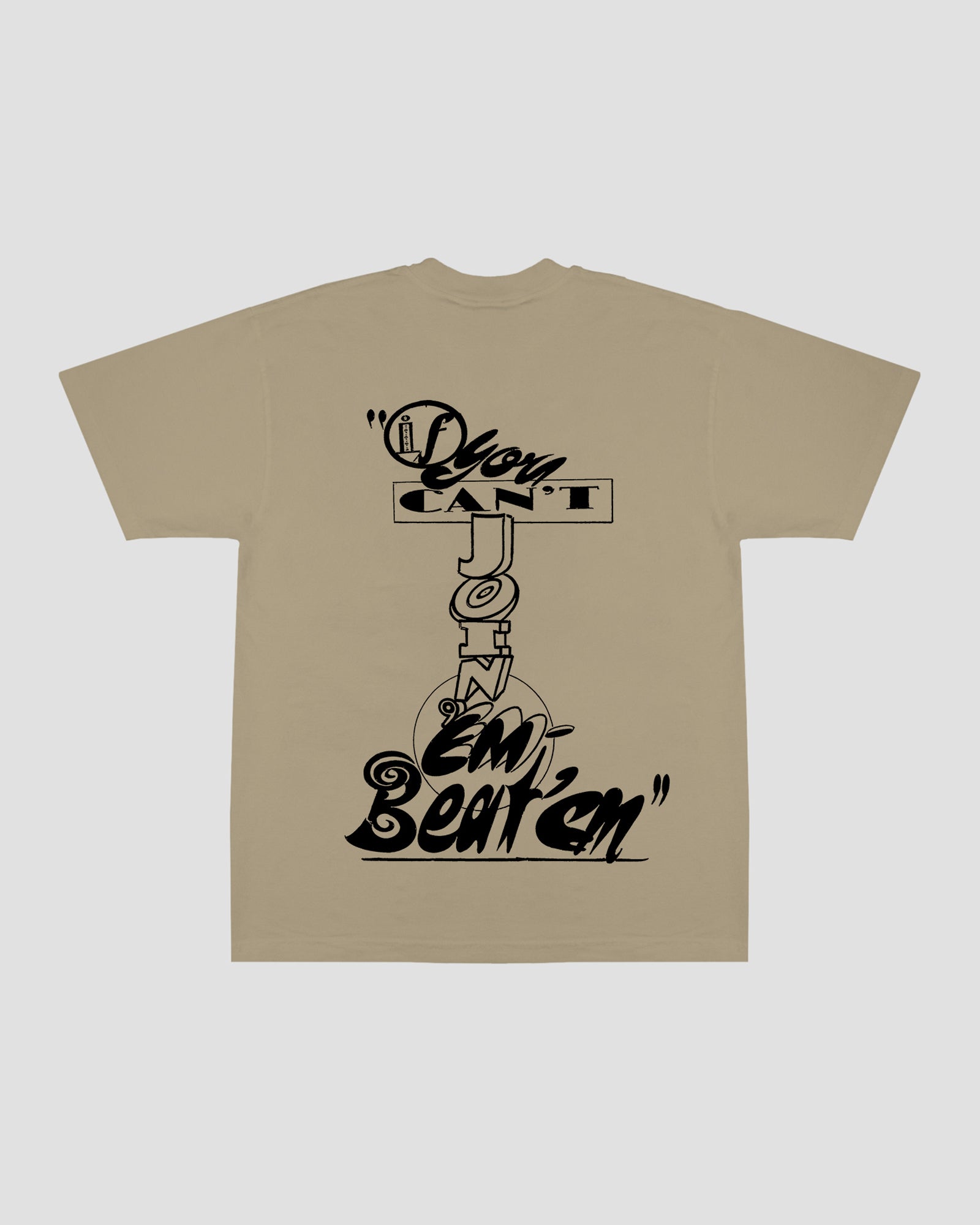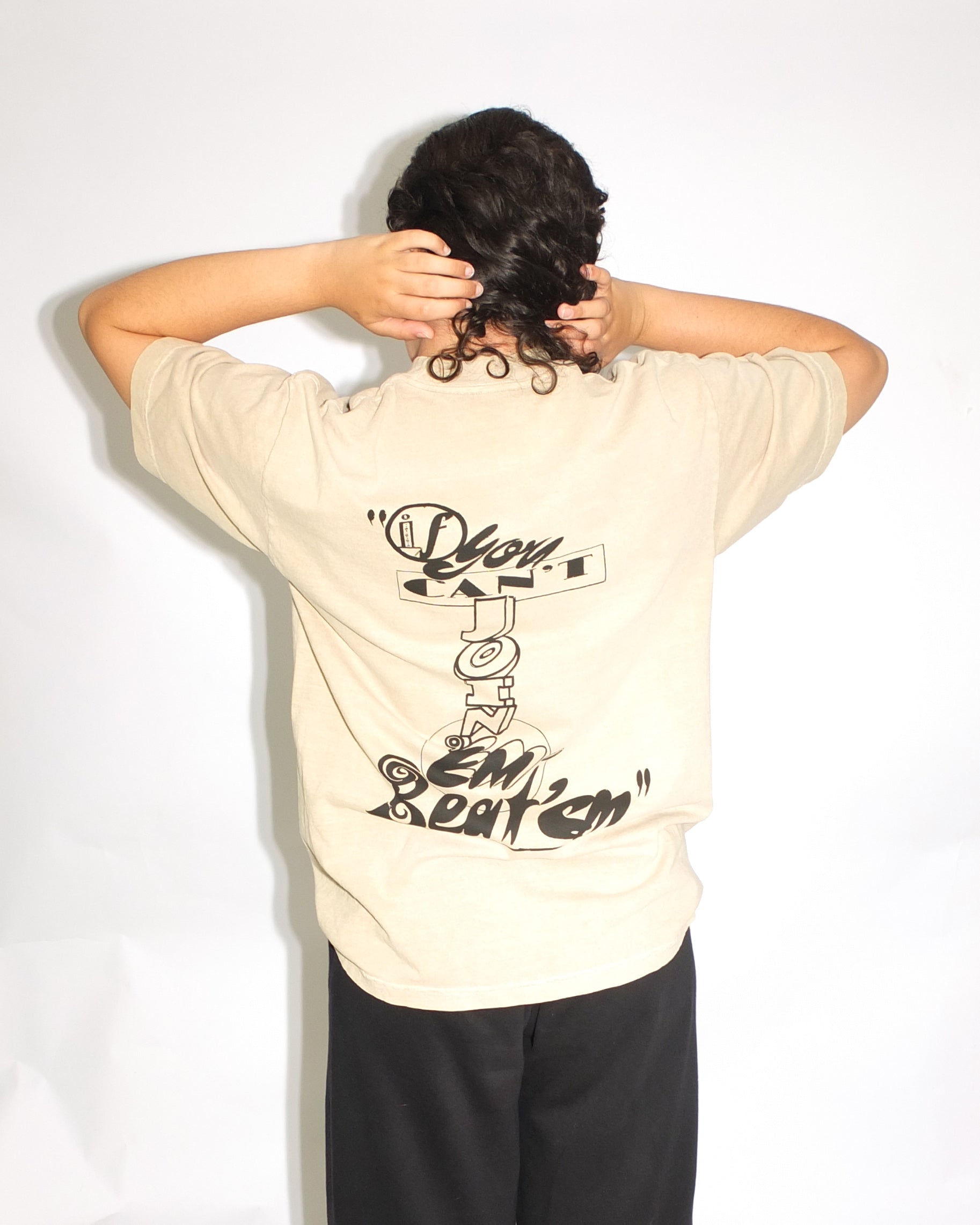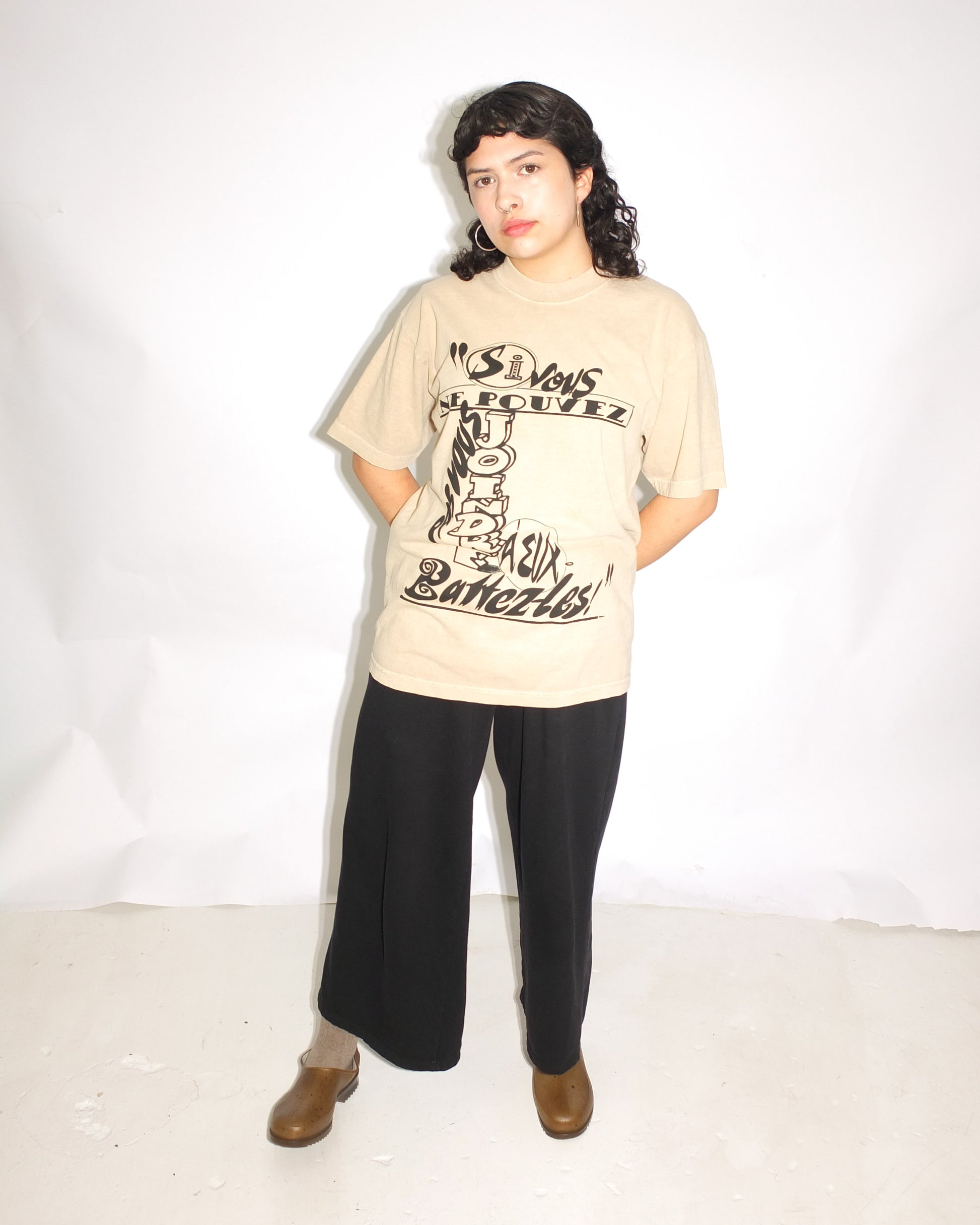 6.5oz Ringspun Cotton Short Sleeve Shirt in Sand, Made in LA. Printed in Portland. Featuring 1-color oversized front and back print. Custom FISK size garment label on inside neck.