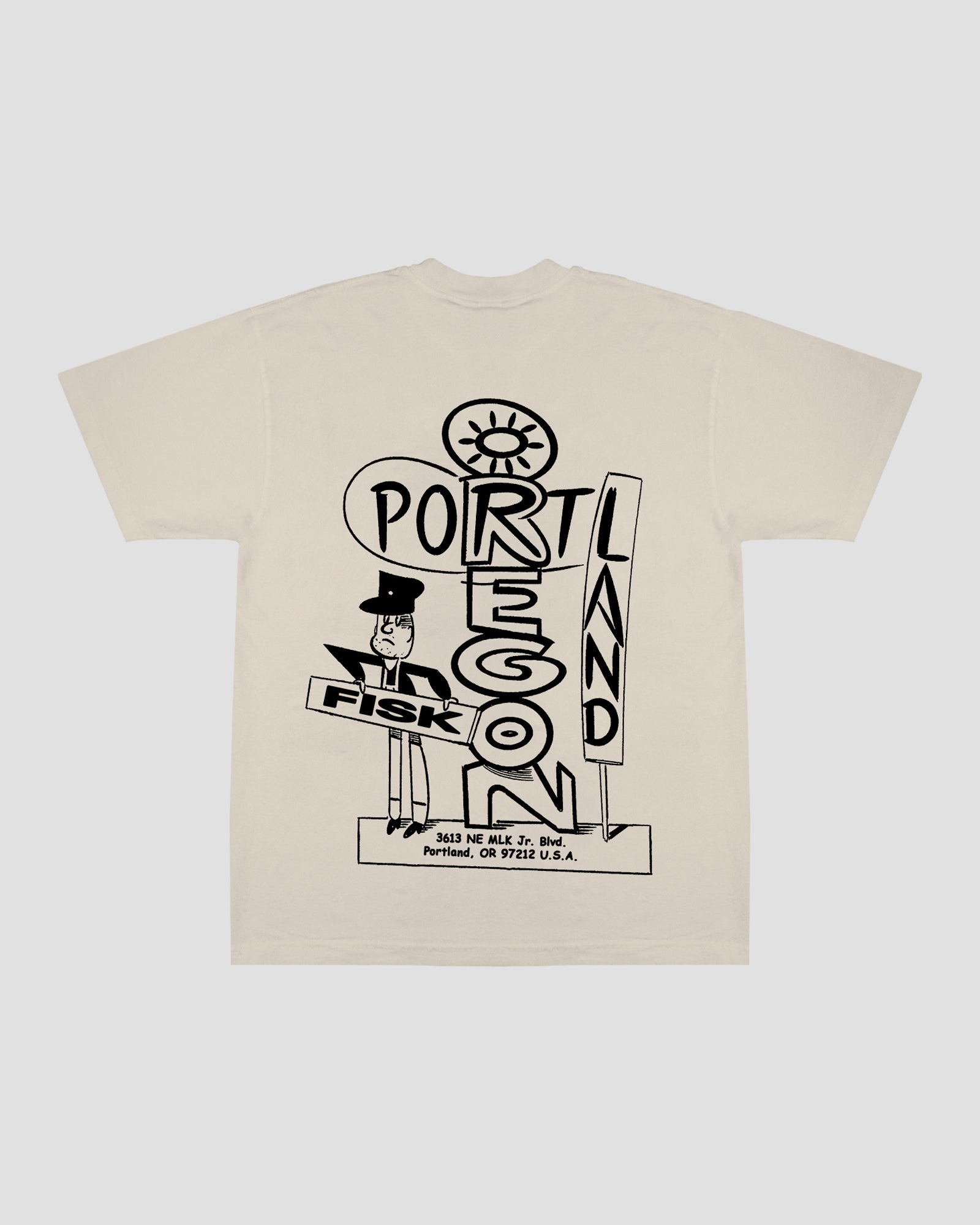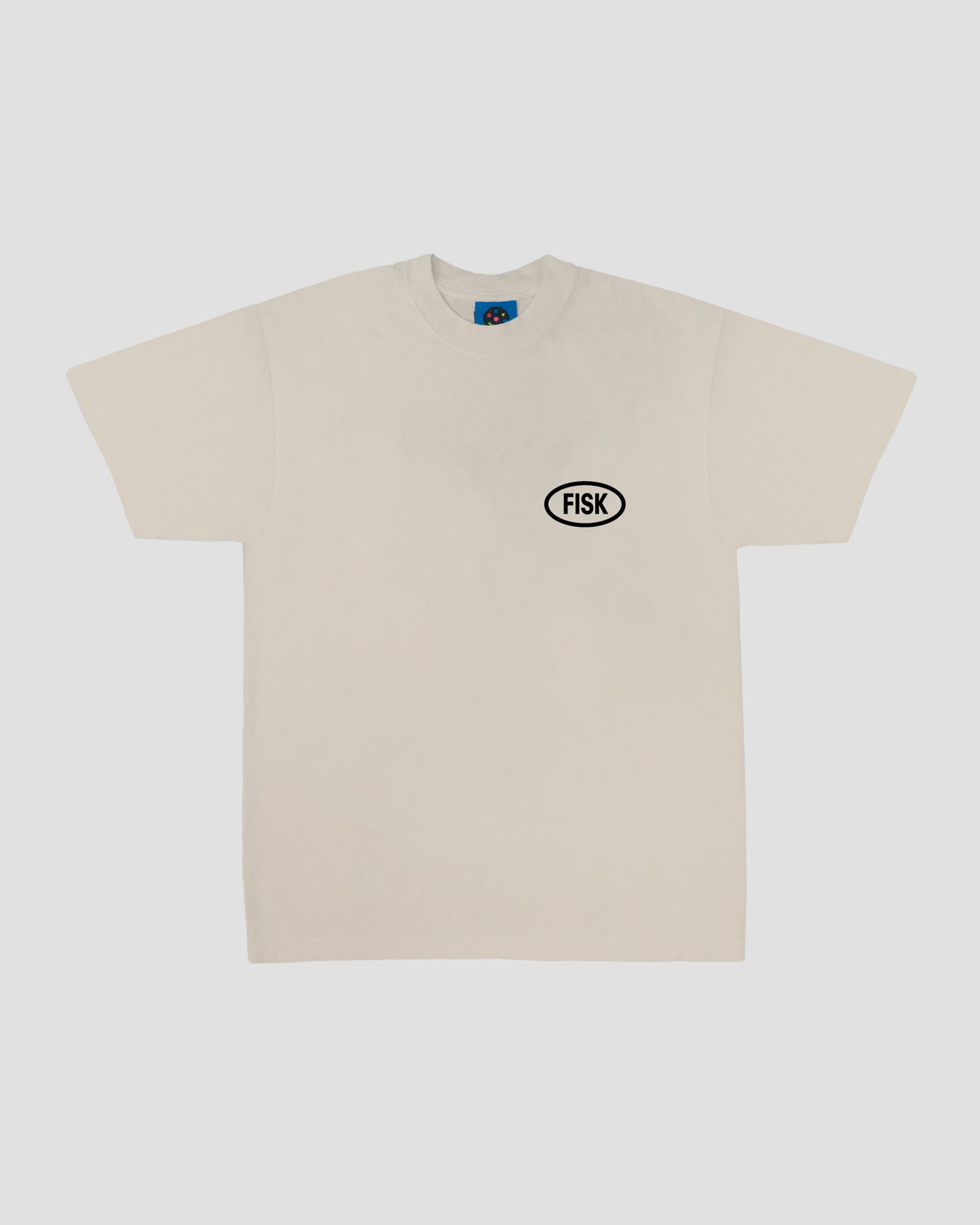 6.5oz Ringspun Cotton Short Sleeve Shirt in Creme, Made in LA. Printed in Portland. Featuring 1-color chest print and oversized back print. Custom FISK size garment label on inside neck.