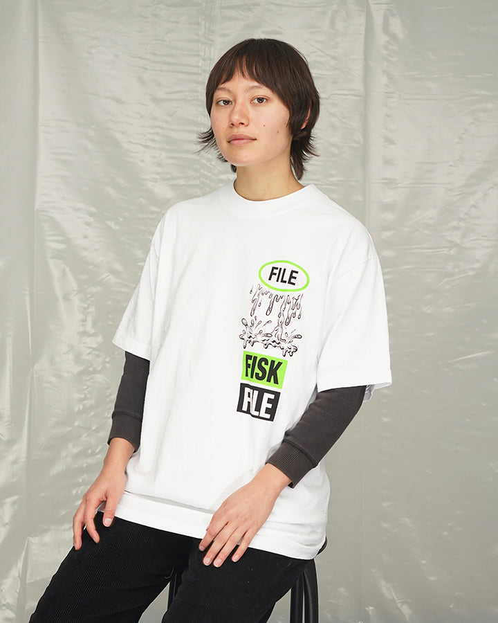 6.5oz Ringspun Cotton Short Sleeve Shirt in White. Made in LA. Printed in Portland. Featuring 2-color screenprint front and 1-color oversize screenprint back. Custom FISK size garment label on inside neck.