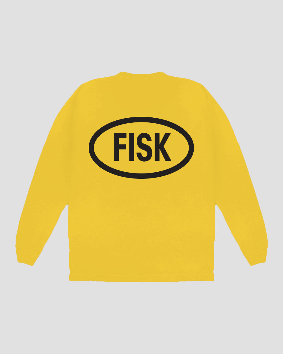 6.5oz Ringspun Cotton L/S Shirt in Marigold, Made in LA. Printed in Portland. Featuring 1-color chest print front and large oversize print on back. Custom FISK size garment label on inside neck.