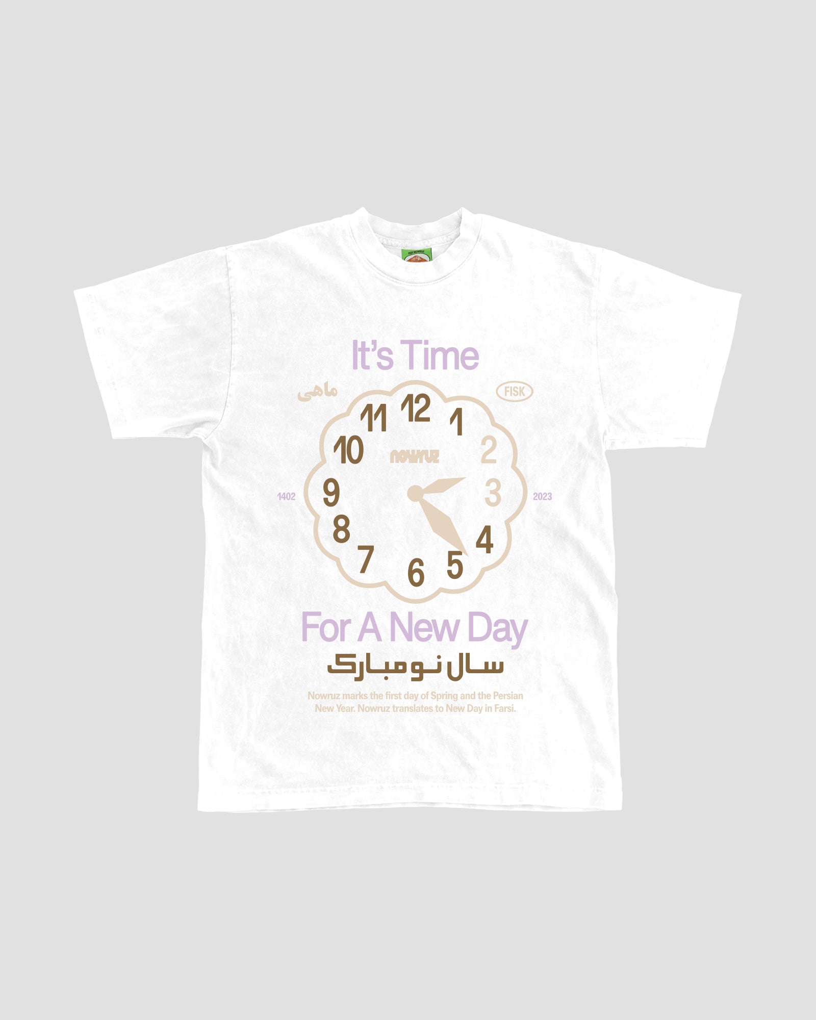 6.5oz Ringspun Cotton Short Sleeve Shirt in White, Made in LA, printed in Portland. Featuring 3-color oversize print on front. Custom Nowruz 1402 size garment label on inside neck.