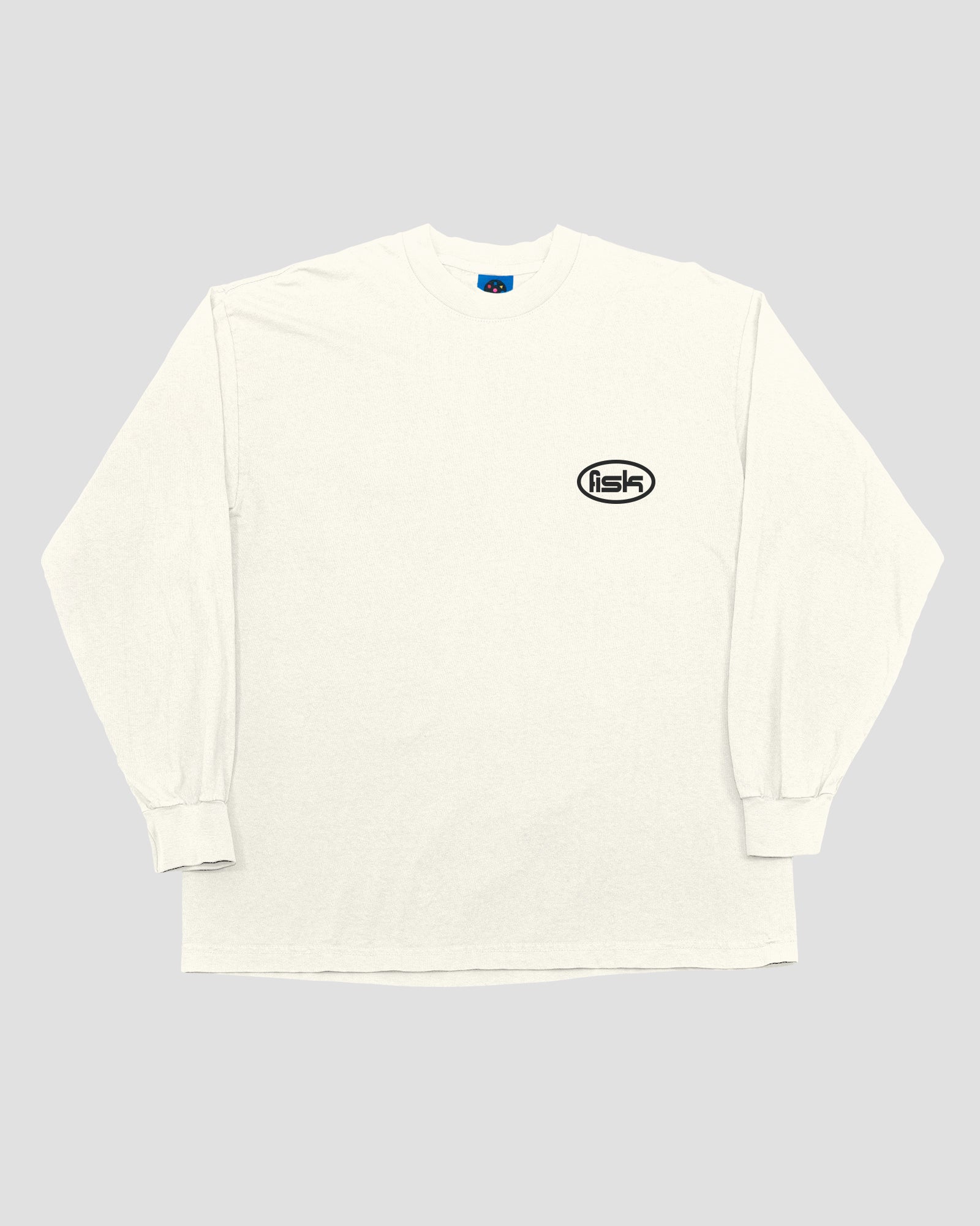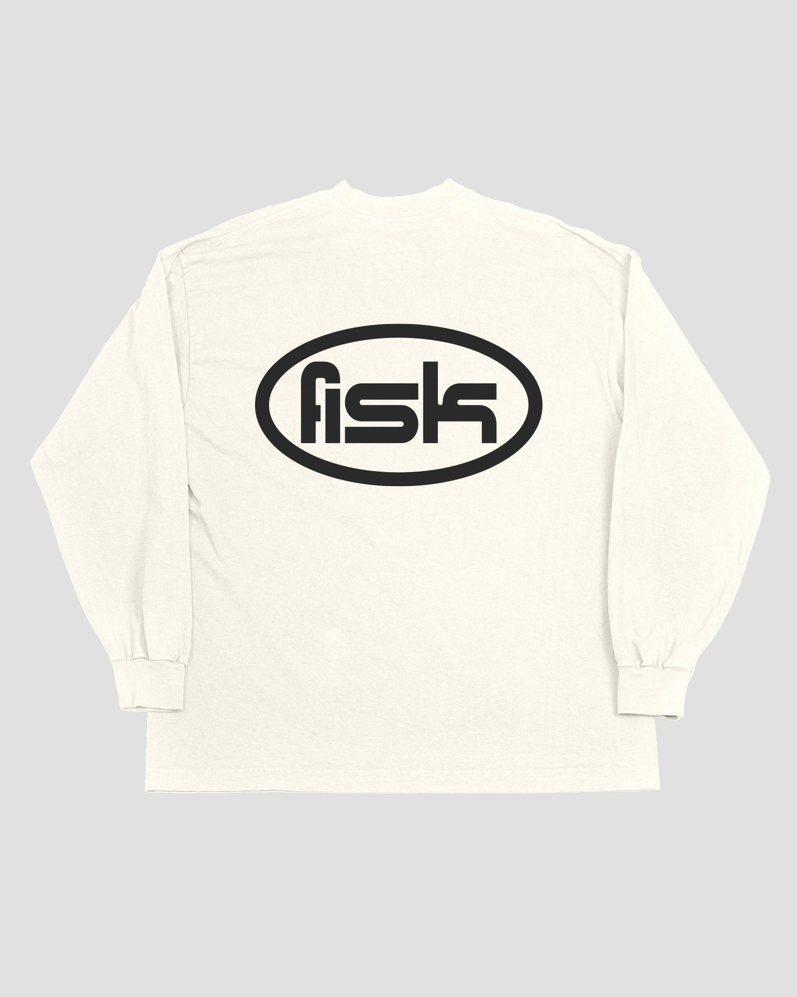 6.5oz Ringspun Cotton Short Long Sleeve Shirt in Off-White, Made in LA. Printed in Portland. Featuring 1-color chest print front and oversize print on back. Custom FISK size garment label on inside neck.