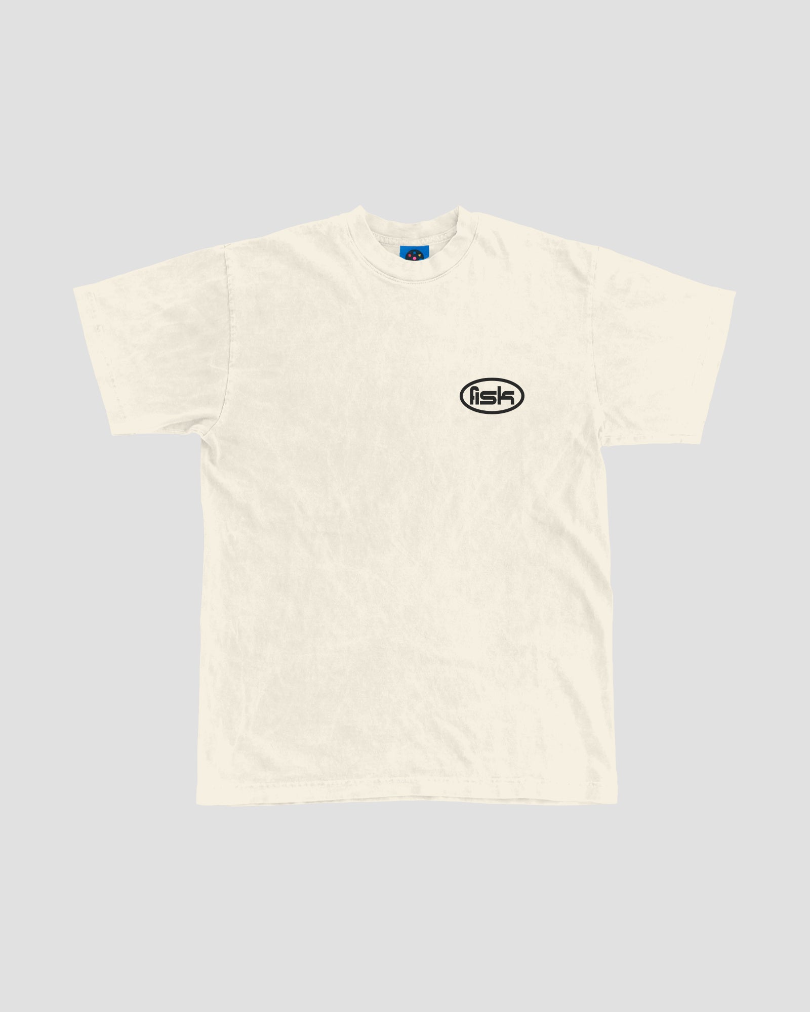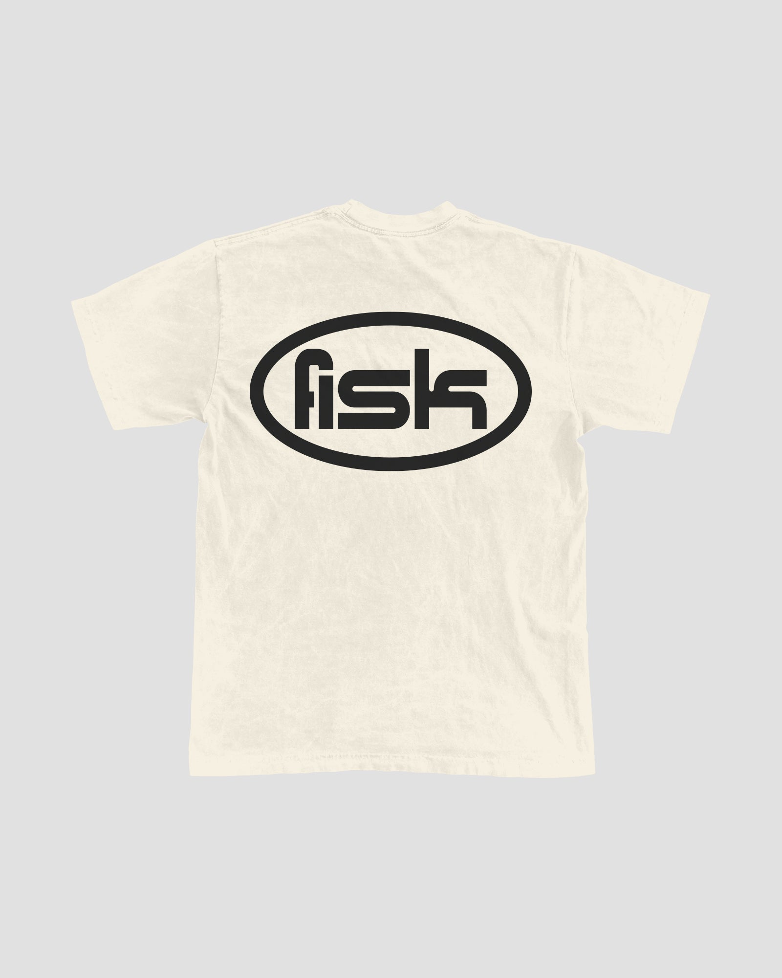 6.5oz Ringspun Cotton Short Sleeve Shirt in Creme, Made in LA. Printed in Portland. Featuring 1-color chest print front and oversize print on back. Custom FISK size garment label on inside neck.