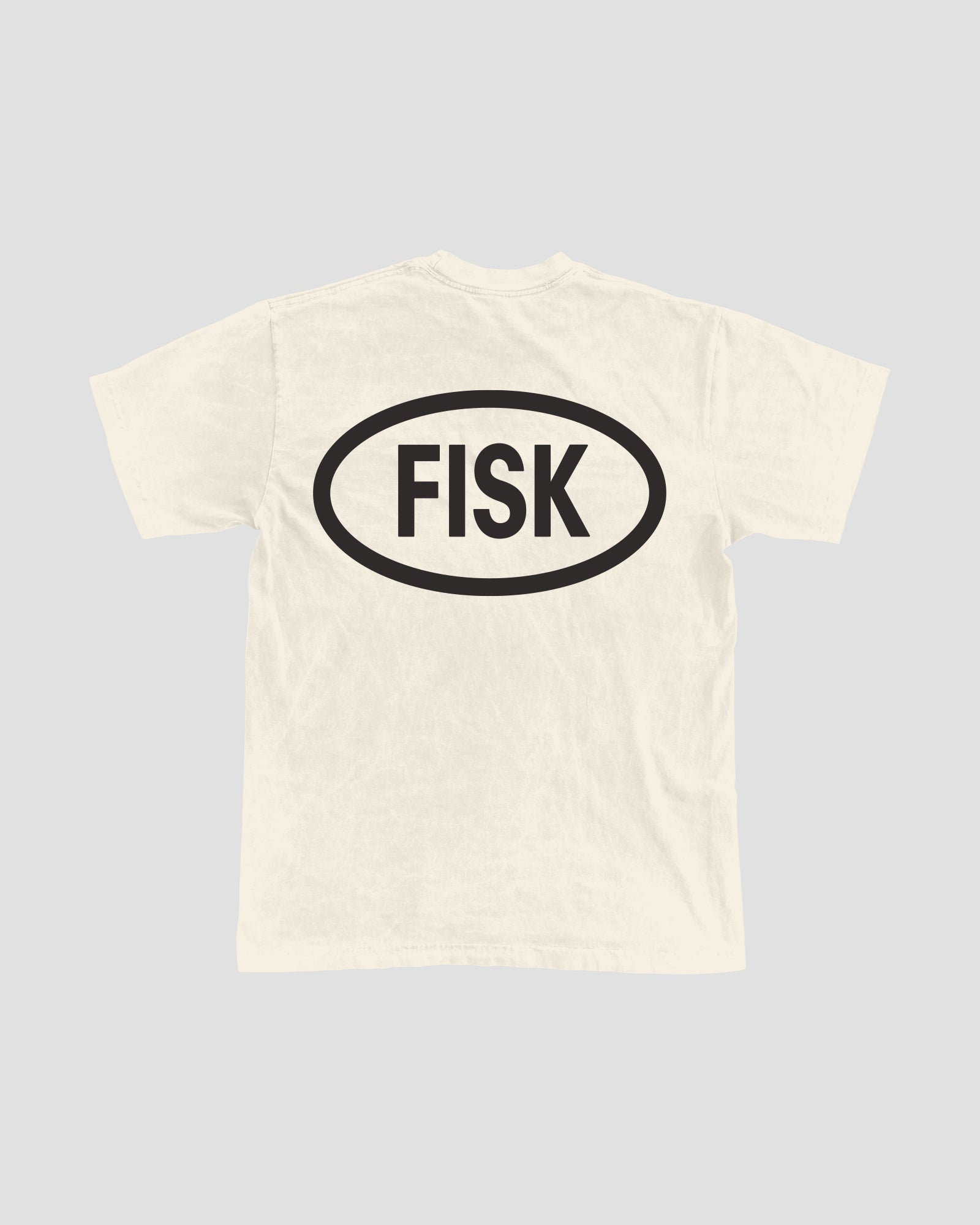 6.5oz Ringspun Cotton Short Sleeve Shirt in Creme, Made in LA. Printed in Portland. Featuring 1-color chest print front and oversize print on back. Custom FISK size garment label on inside neck.