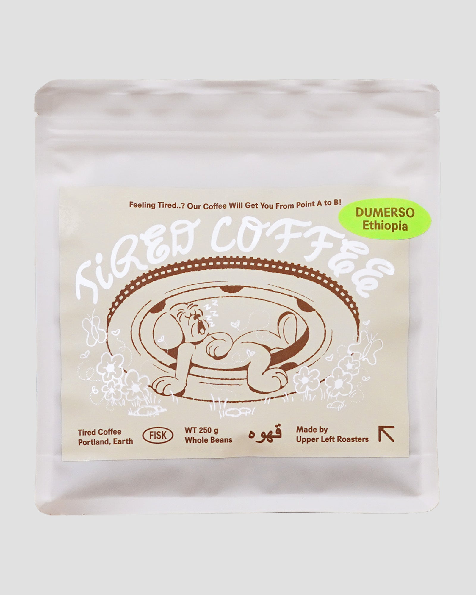 Tired Coffee is made of beans from Dumerso, a women-owned and operated farm in Yirgacheffe, Gedeo, Ethiopia. Elevation: 1880 to 2200 MASL