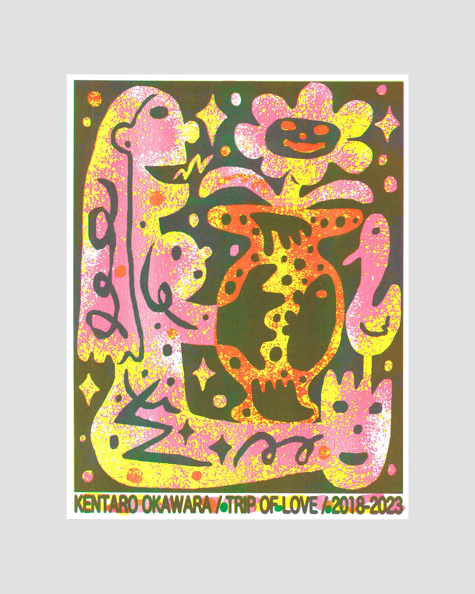 9.75x12.75", 3 color risograph print on 130lb cover, edition of 40. Artwork by Seoul based artist Kentaro Okawara. Produced for the collection release of Okawara's Trip of Love Collection at FISK 05.27.2023.